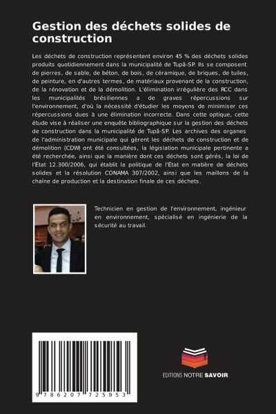 Les déchets de construction représentent environ 45 % des déchets solides produits quotidiennement dans la municipalité de Tupã-SP. Ils se composent de pierres, de sable, de béton, de bois, de céramique, de briques, de tuiles, de peinture, en d'autres termes, de matériaux provenant de la construction, de la rénovation et de la démolition. L'élimination irrégulière des RCC dans les municipalités brésiliennes a de graves répercussions sur l'environnement, d'où la nécessité d'étudier les moyens de minimiser ces répercussions dues à une élimination incorrecte. Dans cette optique, cette étude vise à réaliser une enquête bibliographique sur la gestion des déchets de construction dans la municipalité de Tupã-SP. Les archives des organes de l'administration municipale qui gèrent les déchets de construction et de démolition (CDW) ont été consultées, la législation municipale pertinente a été recherchée, ainsi que la manière dont ces déchets sont gérés, la loi de l'État 12.300/2006, qui établit la politique de l'État en matière de déchets solides et la résolution CONAMA 307/2002, ainsi que les maillons de la chaîne de production et la destination finale de ces déchets.