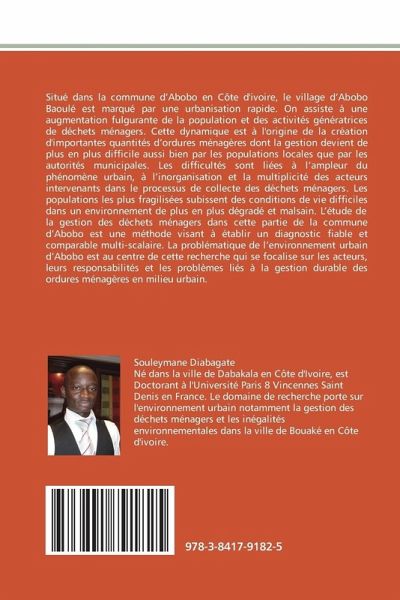 Situé dans la commune d Abobo en Côte d'ivoire, le village d Abobo Baoulé est marqué par une urbanisation rapide. On assiste à une augmentation fulgurante de la population et des activités génératrices de déchets ménagers. Cette dynamique est à l'origine de la création d'importantes quantités d ordures ménagères dont la gestion devient de plus en plus difficile aussi bien par les populations locales que par les autorités municipales. Les difficultés sont liées à l ampleur du phénomène urbain, à l inorganisation et la multiplicité des acteurs intervenants dans le processus de collecte des déchets ménagers. Les populations les plus fragilisées subissent des conditions de vie difficiles dans un environnement de plus en plus dégradé et malsain. L étude de la gestion des déchets ménagers dans cette partie de la commune d Abobo est une méthode visant à établir un diagnostic fiable et comparable multi-scalaire. La problématique de l environnement urbain d Abobo est au centre de cette recherche qui se focalise sur les acteurs, leurs responsabilités et les problèmes liés à la gestion durable des ordures ménagères en milieu urbain.