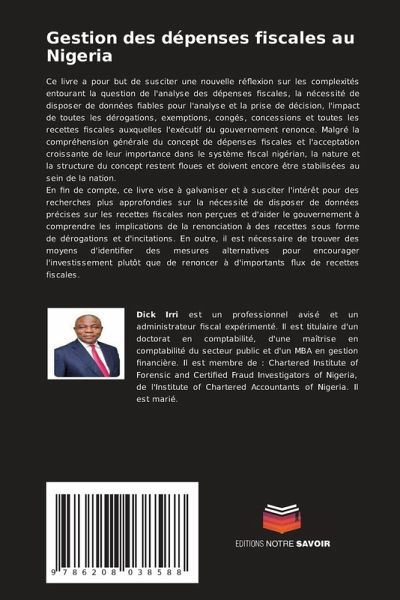 Ce livre a pour but de susciter une nouvelle réflexion sur les complexités entourant la question de l'analyse des dépenses fiscales, la nécessité de disposer de données fiables pour l'analyse et la prise de décision, l'impact de toutes les dérogations, exemptions, congés, concessions et toutes les recettes fiscales auxquelles l'exécutif du gouvernement renonce. Malgré la compréhension générale du concept de dépenses fiscales et l'acceptation croissante de leur importance dans le système fiscal nigérian, la nature et la structure du concept restent floues et doivent encore être stabilisées au sein de la nation.En fin de compte, ce livre vise à galvaniser et à susciter l'intérêt pour des recherches plus approfondies sur la nécessité de disposer de données précises sur les recettes fiscales non perçues et d'aider le gouvernement à comprendre les implications de la renonciation à des recettes sous forme de dérogations et d'incitations. En outre, il est nécessaire de trouver des moyens d'identifier des mesures alternatives pour encourager l'investissement plutôt que de renoncer à d'importants flux de recettes fiscales.