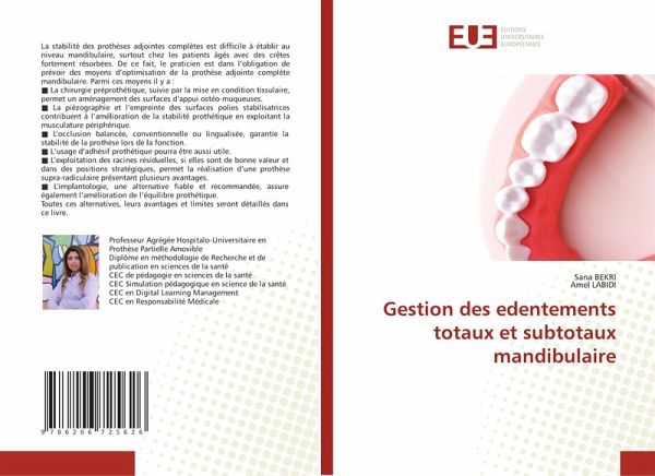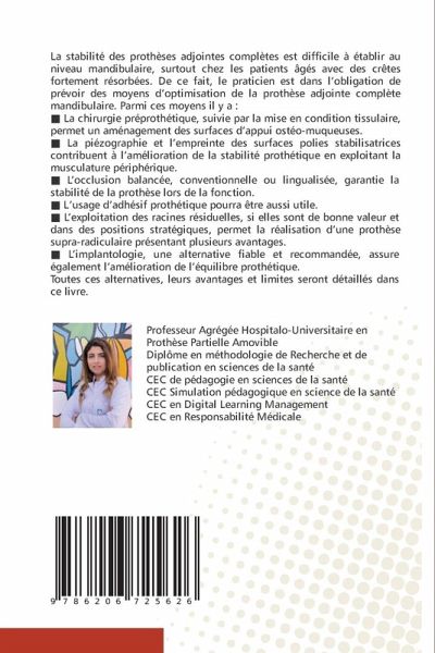 La stabilité des prothèses adjointes complètes est difficile à établir au niveau mandibulaire, surtout chez les patients âgés avec des crêtes fortement résorbées. De ce fait, le praticien est dans l'obligation de prévoir des moyens d'optimisation de la prothèse adjointe complète mandibulaire. Parmi ces moyens il y a :- La chirurgie préprothétique, suivie par la mise en condition tissulaire, permet un aménagement des surfaces d'appui ostéo-muqueuses.- La piézographie et l'empreinte des surfaces polies stabilisatrices contribuent à l'amélioration de la stabilité prothétique en exploitant la musculature périphérique.- L'occlusion balancée, conventionnelle ou lingualisée, garantie la stabilité de la prothèse lors de la fonction.- L'usage d'adhésif prothétique pourra être aussi utile.- L'exploitation des racines résiduelles, si elles sont de bonne valeur et dans des positions stratégiques, permet la réalisation d'une prothèse supra-radiculaire présentant plusieurs avantages.- L'implantologie, une alternative fiable et recommandée, assure également l'amélioration de l'équilibre prothétique.Toutes ces alternatives, leurs avantages et limites seront détaillés dans ce livre.