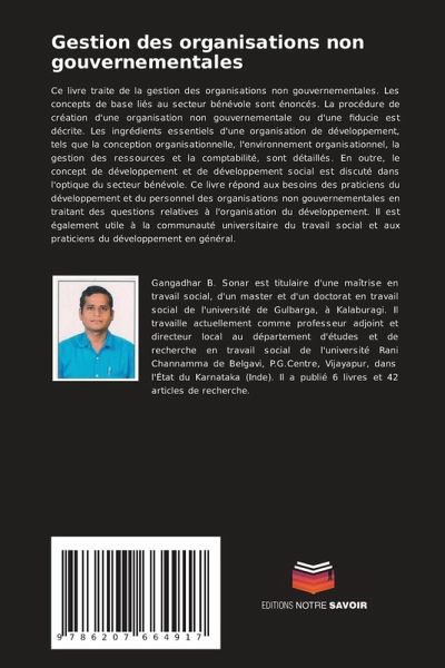 Ce livre traite de la gestion des organisations non gouvernementales. Les concepts de base liés au secteur bénévole sont énoncés. La procédure de création d'une organisation non gouvernementale ou d'une fiducie est décrite. Les ingrédients essentiels d'une organisation de développement, tels que la conception organisationnelle, l'environnement organisationnel, la gestion des ressources et la comptabilité, sont détaillés. En outre, le concept de développement et de développement social est discuté dans l'optique du secteur bénévole. Ce livre répond aux besoins des praticiens du développement et du personnel des organisations non gouvernementales en traitant des questions relatives à l'organisation du développement. Il est également utile à la communauté universitaire du travail social et aux praticiens du développement en général.