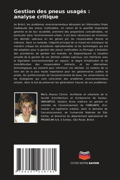 Au Brésil, les problèmes environnementaux découlant de l'élimination finale inadéquate des pneus inutilisables, en raison de la quantité importante générée et de leur durabilité, prennent des proportions considérables, en particulier dans l'environnement urbain. Il est donc nécessaire de minimiser ces déchets spéciaux en les gérant par les responsables directs et indirects. Dans ce contexte, l'objectif principal de ce travail est d'analyser de manière critique les procédures opérationnelles et les technologies qui ont été adoptées pour la gestion des pneus inutilisables au Portugal. L'évolution des procédures de gestion est évaluée, en diagnostiquant la situation actuelle de la gestion de ces déchets solides spéciaux, ses interfaces avec la législation environnementale en vigueur, le degré d'implication et de sensibilisation des responsables indirects, et les alternatives technologiques qui existent pour minimiser ces déchets. Le contenu de ce livre est de la plus haute importance pour les gestionnaires publics et privés, les professionnels de l'assainissement de base, les universitaires et les écologistes qui sont conscients des problèmes environnementaux actuels, dans le but de préserver les générations futures de ces problèmes.