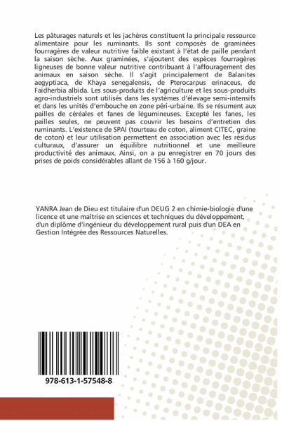 Les pâturages naturels et les jachères constituent la principale ressource alimentaire pour les ruminants. Ils sont composés de graminées fourragères de valeur nutritive faible existant à l'état de paille pendant la saison sèche. Aux graminées, s'ajoutent des espèces fourragères ligneuses de bonne valeur nutritive contribuant à l'affouragement des animaux en saison sèche. Il s'agit principalement de Balanites aegyptiaca, de Khaya senegalensis, de Pterocarpus erinaceus, de Faidherbia albida. Les sous-produits de l'agriculture et les sous-produits agro-industriels sont utilisés dans les systèmes d'élevage semi-intensifs et dans les unités d'embouche en zone péri-urbaine. Ils se résument aux pailles de céréales et fanes de légumineuses. Excepté les fanes, les pailles seules, ne peuvent pas couvrir les besoins d'entretien des ruminants. L'existence de SPAI (tourteau de coton, aliment CITEC, graine de coton) et leur utilisation permettent en association avec les résidus culturaux, d'assurer un équilibre nutritionnel et une meilleure productivité des animaux. Ainsi, on a pu enregistrer en 70 jours des prises de poids considérables allant de 156 à 160 g/jour.