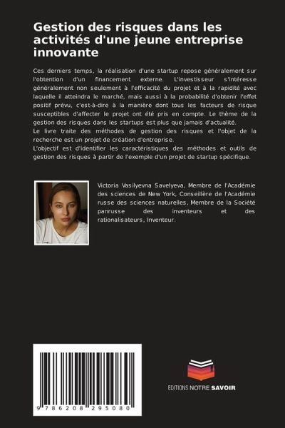 Ces derniers temps, la réalisation d'une startup repose généralement sur l'obtention d'un financement externe. L'investisseur s'intéresse généralement non seulement à l'efficacité du projet et à la rapidité avec laquelle il atteindra le marché, mais aussi à la probabilité d'obtenir l'effet positif prévu, c'est-à-dire à la manière dont tous les facteurs de risque susceptibles d'affecter le projet ont été pris en compte. Le thème de la gestion des risques dans les startups est plus que jamais d'actualité.Le livre traite des méthodes de gestion des risques et l'objet de la recherche est un projet de création d'entreprise. L'objectif est d'identifier les caractéristiques des méthodes et outils de gestion des risques à partir de l'exemple d'un projet de startup spécifique.