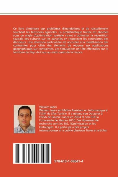 Ce livre s'intéresse aux problèmes d'inondations et de ruissellement touchant les territoires agricoles. La problématique traitée est abordée sous un angle d'optimisation spatiale visant à optimiser la répartition spatiale des cultures sur les parcelles en respectant les contraintes des décideurs. Une attention particulière est accordée à la modélisation des contraintes pour offrir des éléments de réponse aux applications géographiques sur-contraintes. Les simulations ont été effectuées sur le territoire du Pays de Caux au nord-ouest de la France.