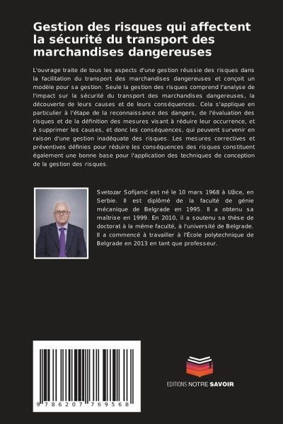 L'ouvrage traite de tous les aspects d'une gestion réussie des risques dans la facilitation du transport des marchandises dangereuses et conçoit un modèle pour sa gestion. Seule la gestion des risques comprend l'analyse de l'impact sur la sécurité du transport des marchandises dangereuses, la découverte de leurs causes et de leurs conséquences. Cela s'applique en particulier à l'étape de la reconnaissance des dangers, de l'évaluation des risques et de la définition des mesures visant à réduire leur occurrence, et à supprimer les causes, et donc les conséquences, qui peuvent survenir en raison d'une gestion inadéquate des risques. Les mesures correctives et préventives définies pour réduire les conséquences des risques constituent également une bonne base pour l'application des techniques de conception de la gestion des risques.
