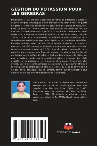 L'expérience a été entreprise pour étudier l'effet de différentes sources et niveaux d'engrais potassiques sur la croissance, le rendement et la qualité du gerbera, dans des conditions de poly-serre au College of Agriculture, Pune au cours de l'année 2005-06. Trois sources de potassium ont été utilisées, à savoir le muriate de potasse, le sulfate de potasse et le nitrate de potasse, et quatre niveaux de potassium, à savoir 75 %, 100 %, 125 % et 150 % K de la dose recommandée, en utilisant un plan factoriel en blocs complètement randomisés avec trois répétitions en conditions contrôlées. L'analyse du lixiviat après 240 jours a indiqué que l'application de murate de potasse a entraîné une augmentation de la teneur en chlore dans le lixiviat, ce qui a augmenté la conductivité électrique du lixiviat, responsable de la réduction du rendement des fleurs de gerbera. Les études sur les lixiviats ont indiqué que le sulfate de potasse était une bonne source de potassium pour le gerbera, tandis que le muriate de potasse a montré des effets négatifs sur la croissance, le rendement et la qualité à un stade plus avancé, c'est-à-dire après 210 jours de plantation, ce qui pourrait être dû à l'accumulation de chlore dans la zone des racines. La dose de 100 % de K a eu des effets bénéfiques sur le gerbera, tandis qu'une application plus élevée de K n'a pas eu d'effet favorable sur le gerbera.