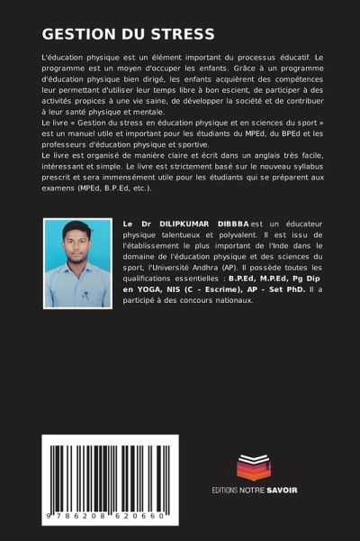 L'éducation physique est un élément important du processus éducatif. Le programme est un moyen d'occuper les enfants. Grâce à un programme d'éducation physique bien dirigé, les enfants acquièrent des compétences leur permettant d'utiliser leur temps libre à bon escient, de participer à des activités propices à une vie saine, de développer la société et de contribuer à leur santé physique et mentale.Le livre « Gestion du stress en éducation physique et en sciences du sport » est un manuel utile et important pour les étudiants du MPEd, du BPEd et les professeurs d'éducation physique et sportive. Le livre est organisé de manière claire et écrit dans un anglais très facile, intéressant et simple. Le livre est strictement basé sur le nouveau syllabus prescrit et sera immensément utile pour les étudiants qui se préparent aux examens (MPEd, B.P.Ed, etc.).