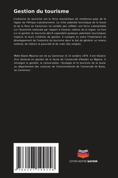 L'industrie du tourisme est la force économique de nombreux pays de la région de l'Afrique subsaharienne. Le riche potentiel touristique de la faune et de la flore du Cameroun ne semble pas refléter une force substantielle sur l'économie nationale par rapport à d'autres nations de la région. Le livre sur la gestion du tourisme décrit cependant quelques potentiels touristiques majeurs et leurs schémas de gestion. Il souligne en outre l'importance du développement de l'industrie du tourisme dans le but de générer un revenu national, de réduire la pauvreté et de créer des emplois.