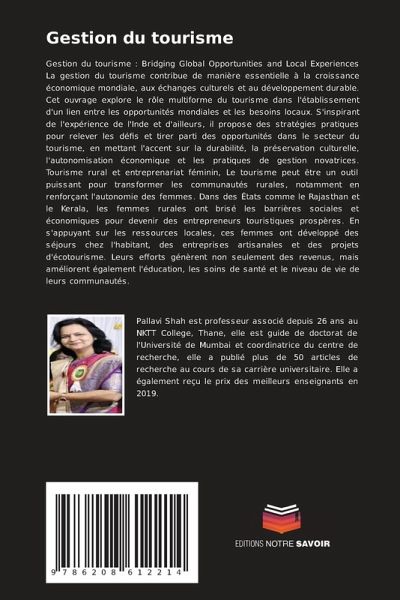 Gestion du tourisme : Bridging Global Opportunities and Local Experiences La gestion du tourisme contribue de manière essentielle à la croissance économique mondiale, aux échanges culturels et au développement durable. Cet ouvrage explore le rôle multiforme du tourisme dans l'établissement d'un lien entre les opportunités mondiales et les besoins locaux. S'inspirant de l'expérience de l'Inde et d'ailleurs, il propose des stratégies pratiques pour relever les défis et tirer parti des opportunités dans le secteur du tourisme, en mettant l'accent sur la durabilité, la préservation culturelle, l'autonomisation économique et les pratiques de gestion novatrices. Tourisme rural et entreprenariat féminin, Le tourisme peut être un outil puissant pour transformer les communautés rurales, notamment en renforçant l'autonomie des femmes. Dans des États comme le Rajasthan et le Kerala, les femmes rurales ont brisé les barrières sociales et économiques pour devenir des entrepreneurs touristiques prospères. En s'appuyant sur les ressources locales, ces femmes ont développé des séjours chez l'habitant, des entreprises artisanales et des projets d'écotourisme. Leurs efforts génèrent non seulement des revenus, mais améliorent également l'éducation, les soins de santé et le niveau de vie de leurs communautés.