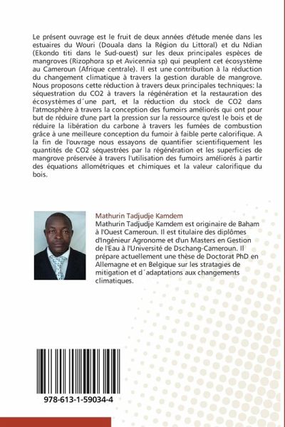 Le présent ouvrage est le fruit de deux années d'étude menée dans les estuaires du Wouri (Douala dans la Région du Littoral) et du Ndian (Ekondo titi dans le Sud-ouest) sur les deux principales espèces de mangroves (Rizophora sp et Avicennia sp) qui peuplent cet écosystème au Cameroun (Afrique centrale). Il est une contribution à la réduction du changement climatique à travers la gestion durable de mangrove. Nous proposons cette réduction à travers deux principales techniques: la séquestration du CO2 à travers la régénération et la restauration des écosystèmes d´une part, et la réduction du stock de CO2 dans l'atmosphère à travers la conception des fumoirs améliorés qui ont pour but de réduire d'une part la pression sur la ressource qu'est le bois et de réduire la libération du carbone à travers les fumées de combustion grâce à une meilleure conception du fumoir à faible perte calorifique. A la fin de l'ouvrage nous essayons de quantifier scientifiquement les quantités de CO2 séquestrées par la régénération et les superficies de mangrove préservée à travers l'utilisation des fumoirs améliorés à partir des équations allométriques et chimiques et la valeur calorifique du bois.