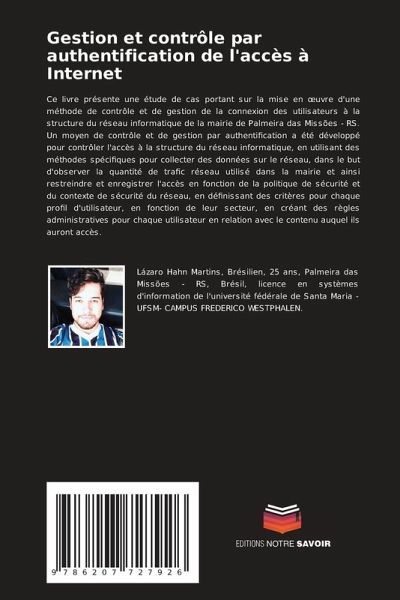 Ce livre présente une étude de cas portant sur la mise en oeuvre d'une méthode de contrôle et de gestion de la connexion des utilisateurs à la structure du réseau informatique de la mairie de Palmeira das Missões - RS. Un moyen de contrôle et de gestion par authentification a été développé pour contrôler l'accès à la structure du réseau informatique, en utilisant des méthodes spécifiques pour collecter des données sur le réseau, dans le but d'observer la quantité de trafic réseau utilisé dans la mairie et ainsi restreindre et enregistrer l'accès en fonction de la politique de sécurité et du contexte de sécurité du réseau, en définissant des critères pour chaque profil d'utilisateur, en fonction de leur secteur, en créant des règles administratives pour chaque utilisateur en relation avec le contenu auquel ils auront accès.