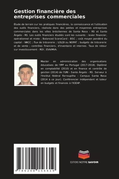 Étude de terrain sur les pratiques financières, la connaissance et l'utilisation des outils financiers, réalisée dans des petites et moyennes entreprises commerciales dans les villes brésiliennes de Santa Rosa - RS et Santo Ângelo - RS. Les outils financiers étudiés sont les suivants : levier financier, opérationnel et mixte ; Balanced ScoreCard - BSC ; coût moyen pondéré du capital - WACC ; flux de trésorerie ; LOLDI ou NOPAT ; budgets de trésorerie et de vente ; contrôles financiers, d'inventaire et internes. Taux de retour sur investissement - ROI ; EVA/MVA.