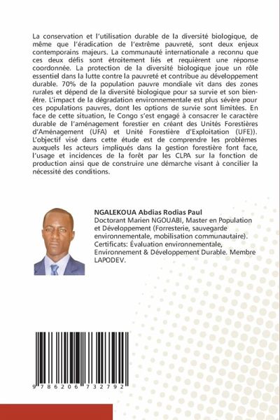 La conservation et l'utilisation durable de la diversité biologique, de même que l'éradication de l'extrême pauvreté, sont deux enjeux contemporains majeurs. La communauté internationale a reconnu que ces deux défis sont étroitement liés et requièrent une réponse coordonnée. La protection de la diversité biologique joue un rôle essentiel dans la lutte contre la pauvreté et contribue au développement durable. 70% de la population pauvre mondiale vit dans des zones rurales et dépend de la diversité biologique pour sa survie et son bien-être. L'impact de la dégradation environnementale est plus sévère pour ces populations pauvres, dont les options de survie sont limitées. En face de cette situation, le Congo s'est engagé à consacrer le caractère durable de l'aménagement forestier en créant des Unités Forestières d'Aménagement (UFA) et Unité Forestière d'Exploitation (UFE)). L'objectif visé dans cette étude est de comprendre les problèmes auxquels les acteurs impliqués dans la gestion forestière font face, l'usage et incidences de la forêt par les CLPA sur la fonction de production ainsi que de construire une démarche visant à concilier la nécessité des conditions.