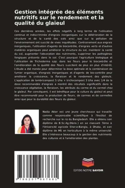 Ces dernières années, les effets négatifs à long terme de l'utilisation continue et indiscriminée d'engrais inorganiques sur la détérioration de la structure et de la santé des sols ainsi que sur la pollution de l'environnement ont suscité de vives inquiétudes. Contrairement aux engrais inorganiques, l'utilisation d'agents de biocontrôle, d'engrais verts et d'autres matières organiques peut améliorer la structure du sol, maintenir la santé du sol, augmenter l'absorption des nutriments, supprimer les pathogènes fongiques présents dans le sol. C'est pourquoi l'agriculture biologique et l'utilisation de Trichoderma spp. dans les fleurs pour le biocontrôle et l'amélioration de la qualité des fleurs suscitent de plus en plus d'intérêt. L'étude a été menée pour déterminer la dose optimale et la combinaison de fumier organique, d'engrais inorganiques et d'agents de bio-contrôle pour améliorer la croissance, la floraison et le rendement des glaïeuls. L'application de lombricompost 5 t/ha + trichocompost 3 t/ha avec 1/4 de la dose recommandée d'engrais a montré des résultats significatifs dans la croissance végétative, la floraison, les attributs du corme et du cormel chez le glaïeul. Par conséquent, il est bénéfique pour la culture du glaïeul et peut être recommandé pour la production de fleurs, de cormes et de cormelles ainsi que pour la durabilité des fleurs du glaïeul.