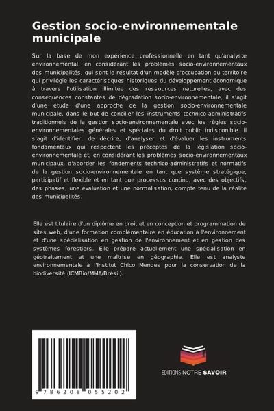 Sur la base de mon expérience professionnelle en tant qu'analyste environnemental, en considérant les problèmes socio-environnementaux des municipalités, qui sont le résultat d'un modèle d'occupation du territoire qui privilégie les caractéristiques historiques du développement économique à travers l'utilisation illimitée des ressources naturelles, avec des conséquences constantes de dégradation socio-environnementale, il s'agit d'une étude d'une approche de la gestion socio-environnementale municipale, dans le but de concilier les instruments technico-administratifs traditionnels de la gestion socio-environnementale avec les règles socio-environnementales générales et spéciales du droit public indisponible. Il s'agit d'identifier, de décrire, d'analyser et d'évaluer les instruments fondamentaux qui respectent les préceptes de la législation socio-environnementale et, en considérant les problèmes socio-environnementaux municipaux, d'aborder les fondements technico-administratifs et normatifs de la gestion socio-environnementale en tant que système stratégique, participatif et flexible et en tant que processus continu, avec des objectifs, des phases, une évaluation et une normalisation, compte tenu de la réalité des municipalités.