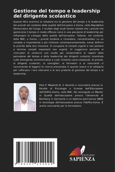 Questo libro esamina la relazione tra la gestione del tempo e la leadership dei presidi nel contesto della qualità dell'istruzione a Goma, nella Repubblica Democratica del Congo. I risultati degli studi hanno rivelato che i presidi che gestiscono il tempo in modo efficace sono in una posizione di leadership per influenzare lo sviluppo della qualità dell'istruzione. Tuttavia, nel contesto della RDC, a Goma, i presidi tendono a rimandare, concentrandosi su un compito o rispondendo a più richieste contemporaneamente, senza definire le priorità della loro missione. Si occupano di compiti urgenti e non portano a termine compiti importanti non urgenti. Si suggerisce pertanto ai ricercatori di condurre uno studio per comprendere le ragioni della percezione del tempo e della leadership dei dirigenti scolastici incentrata sulle emergenze amministrative e sulle richieste socio-relazionali. Ai presidi, ai dirigenti scolastici, ai consiglieri, ai formatori e ai consulenti si raccomanda di leggere la ricerca presentata in questo lavoro e di utilizzarla per rafforzare i loro interventi e le loro pratiche di gestione del tempo e di leadership.