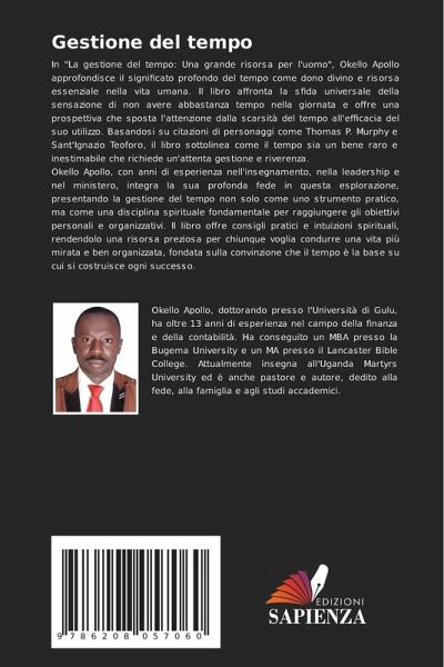 In "La gestione del tempo: Una grande risorsa per l'uomo", Okello Apollo approfondisce il significato profondo del tempo come dono divino e risorsa essenziale nella vita umana. Il libro affronta la sfida universale della sensazione di non avere abbastanza tempo nella giornata e offre una prospettiva che sposta l'attenzione dalla scarsità del tempo all'efficacia del suo utilizzo. Basandosi su citazioni di personaggi come Thomas P. Murphy e Sant'Ignazio Teoforo, il libro sottolinea come il tempo sia un bene raro e inestimabile che richiede un'attenta gestione e riverenza.Okello Apollo, con anni di esperienza nell'insegnamento, nella leadership e nel ministero, integra la sua profonda fede in questa esplorazione, presentando la gestione del tempo non solo come uno strumento pratico, ma come una disciplina spirituale fondamentale per raggiungere gli obiettivi personali e organizzativi. Il libro offre consigli pratici e intuizioni spirituali, rendendolo una risorsa preziosa per chiunque voglia condurre una vita più mirata e ben organizzata, fondata sulla convinzione che il tempo è la base su cui si costruisce ogni successo.