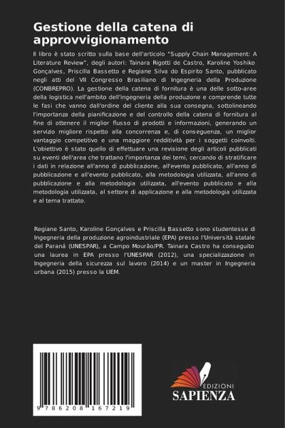 Il libro è stato scritto sulla base dell'articolo ¿Supply Chain Management: A Literature Review¿, degli autori: Tainara Rigotti de Castro, Karoline Yoshiko Gonçalves, Priscilla Bassetto e Regiane Silva do Espirito Santo, pubblicato negli atti del VII Congresso Brasiliano di Ingegneria della Produzione (CONBREPRO). La gestione della catena di fornitura è una delle sotto-aree della logistica nell'ambito dell'ingegneria della produzione e comprende tutte le fasi che vanno dall'ordine del cliente alla sua consegna, sottolineando l'importanza della pianificazione e del controllo della catena di fornitura al fine di ottenere il miglior flusso di prodotti e informazioni, generando un servizio migliore rispetto alla concorrenza e, di conseguenza, un miglior vantaggio competitivo e una maggiore redditività per i soggetti coinvolti. L'obiettivo è stato quello di effettuare una revisione degli articoli pubblicati su eventi dell'area che trattano l'importanza dei temi, cercando di stratificare i dati in relazione all'anno di pubblicazione, all'evento pubblicato, all'anno di pubblicazione e all'evento pubblicato, alla metodologia utilizzata, all'anno di pubblicazione e alla metodologia utilizzata, all'evento pubblicato e alla metodologia utilizzata, al settore di applicazione e alla metodologia utilizzata e al tema trattato.