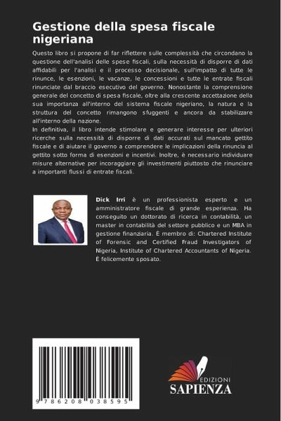 Questo libro si propone di far riflettere sulle complessità che circondano la questione dell'analisi delle spese fiscali, sulla necessità di disporre di dati affidabili per l'analisi e il processo decisionale, sull'impatto di tutte le rinunce, le esenzioni, le vacanze, le concessioni e tutte le entrate fiscali rinunciate dal braccio esecutivo del governo. Nonostante la comprensione generale del concetto di spesa fiscale, oltre alla crescente accettazione della sua importanza all'interno del sistema fiscale nigeriano, la natura e la struttura del concetto rimangono sfuggenti e ancora da stabilizzare all'interno della nazione.In definitiva, il libro intende stimolare e generare interesse per ulteriori ricerche sulla necessità di disporre di dati accurati sul mancato gettito fiscale e di aiutare il governo a comprendere le implicazioni della rinuncia al gettito sotto forma di esenzioni e incentivi. Inoltre, è necessario individuare misure alternative per incoraggiare gli investimenti piuttosto che rinunciare a importanti flussi di entrate fiscali.