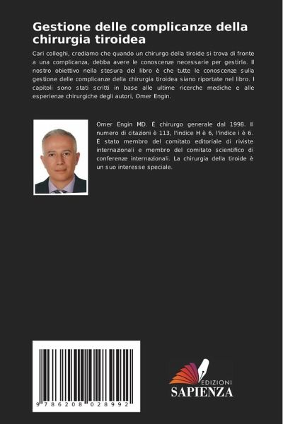 Cari colleghi, crediamo che quando un chirurgo della tiroide si trova di fronte a una complicanza, debba avere le conoscenze necessarie per gestirla. Il nostro obiettivo nella stesura del libro è che tutte le conoscenze sulla gestione delle complicanze della chirurgia tiroidea siano riportate nel libro. I capitoli sono stati scritti in base alle ultime ricerche mediche e alle esperienze chirurgiche degli autori, Omer Engin.