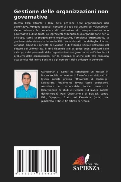 Questo libro affronta i temi della gestione delle organizzazioni non governative. Vengono esposti i concetti di base del settore del volontariato. Viene delineata la procedura di costituzione di un'organizzazione non governativa o di un trust. Gli ingredienti essenziali di un'organizzazione per lo sviluppo, come la progettazione organizzativa, l'ambiente organizzativo, la gestione delle risorse e la contabilità, sono descritti in dettaglio. Inoltre, vengono discussi i concetti di sviluppo e di sviluppo sociale nell'ottica del settore del volontariato. Il libro risponde alle esigenze degli operatori dello sviluppo e del personale delle organizzazioni non governative nell'affrontare i problemi delle organizzazioni per lo sviluppo. È anche utile alla comunità accademica del lavoro sociale e agli operatori dello sviluppo in generale.