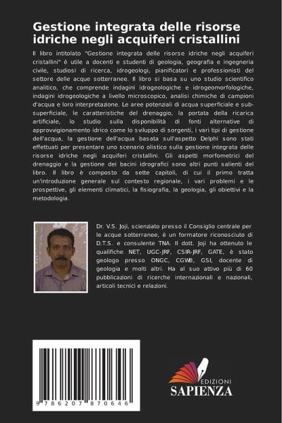 Il libro intitolato "Gestione integrata delle risorse idriche negli acquiferi cristallini" è utile a docenti e studenti di geologia, geografia e ingegneria civile, studiosi di ricerca, idrogeologi, pianificatori e professionisti del settore delle acque sotterranee. Il libro si basa su uno studio scientifico analitico, che comprende indagini idrogeologiche e idrogeomorfologiche, indagini idrogeologiche a livello microscopico, analisi chimiche di campioni d'acqua e loro interpretazione. Le aree potenziali di acqua superficiale e sub-superficiale, le caratteristiche del drenaggio, la portata della ricarica artificiale, lo studio sulla disponibilità di fonti alternative di approvvigionamento idrico come lo sviluppo di sorgenti, i vari tipi di gestione dell'acqua, la gestione dell'acqua basata sull'aspetto Delphi sono stati effettuati per presentare uno scenario olistico sulla gestione integrata delle risorse idriche negli acquiferi cristallini. Gli aspetti morfometrici del drenaggio e la gestione dei bacini idrografici sono altri punti salienti del libro. Il libro è composto da sette capitoli, di cui il primo tratta un'introduzione generale sul contesto regionale, i vari problemi e le prospettive, gli elementi climatici, la fisiografia, la geologia, gli obiettivi e la metodologia.
