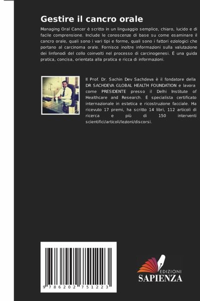 Managing Oral Cancer è scritto in un linguaggio semplice, chiaro, lucido e di facile comprensione. Include le conoscenze di base su come esaminare il cancro orale, quali sono i vari tipi e forme, quali sono i fattori eziologici che portano al carcinoma orale. Fornisce inoltre informazioni sulla valutazione dei linfonodi del collo coinvolti nel processo di carcinogenesi. È una guida pratica, concisa, orientata alla pratica e ricca di informazioni.