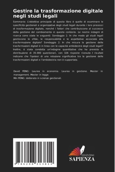 Sommario: L'obiettivo principale di questo libro è quello di esaminare le specificità gestionali e organizzative degli studi legali durante i loro processi di trasformazione digitale, nonché i fattori che contribuiscono al successo della gestione del cambiamento in questo contesto. Le nostre indagini di ricerca sono state le seguenti: Sondaggio 1: In che modo gli studi legali gestiscono le sfide, le responsabilità e le aspettative associate alla trasformazione digitale? Sondaggio 2: In che misura la gestione delle trasformazioni digitali è in linea con le capacità ambidestre degli studi legali? Inoltre, è stata condotta un'indagine quantitativa che ha previsto la distribuzione di 35.000 questionari, con 326 risposte ricevute. I risultati indicano che l'ipotesi di una relazione significativa tra la gestione delle trasformazioni digitali e l'ambidestria non è supportata.