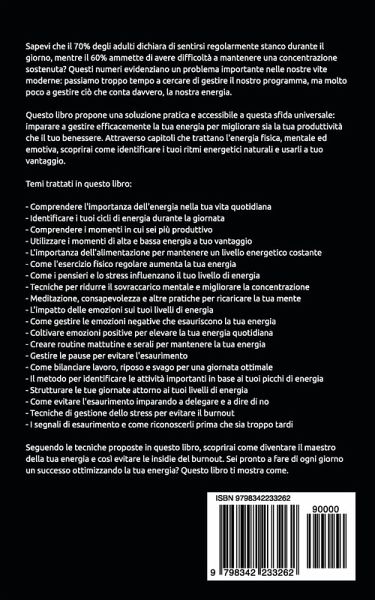Sapevi che il 70% degli adulti dichiara di sentirsi regolarmente stanco durante il giorno, mentre il 60% ammette di avere difficoltà a mantenere una concentrazione sostenuta? Questi numeri evidenziano un problema importante nelle nostre vite moderne: passiamo troppo tempo a cercare di gestire il nostro programma, ma molto poco a gestire ciò che conta davvero, la nostra energia. Questo libro propone una soluzione pratica e accessibile a questa sfida universale: imparare a gestire efficacemente la tua energia per migliorare sia la tua produttività che il tuo benessere. Attraverso capitoli che trattano l'energia fisica, mentale ed emotiva, scoprirai come identificare i tuoi ritmi energetici naturali e usarli a tuo vantaggio. Temi trattati in questo libro: - Comprendere l'importanza dell'energia nella tua vita quotidiana - Identificare i tuoi cicli di energia durante la giornata - Comprendere i momenti in cui sei più produttivo - Utilizzare i momenti di alta e bassa energia a tuo vantaggio - L'importanza dell'alimentazione per mantenere un livello energetico costante - Come l'esercizio fisico regolare aumenta la tua energia - Come i pensieri e lo stress influenzano il tuo livello di energia - Tecniche per ridurre il sovraccarico mentale e migliorare la concentrazione - Meditazione, consapevolezza e altre pratiche per ricaricare la tua mente - L'impatto delle emozioni sui tuoi livelli di energia - Come gestire le emozioni negative che esauriscono la tua energia - Coltivare emozioni positive per elevare la tua energia quotidiana - Creare routine mattutine e serali per mantenere la tua energia - Gestire le pause per evitare l'esaurimento - Come bilanciare lavoro, riposo e svago per una giornata ottimale - Il metodo per identificare le attività importanti in base ai tuoi picchi di energia - Strutturare le tue giornate attorno ai tuoi livelli di energia - Come evitare l'esaurimento imparando a delegare e a dire di no - Tecniche di gestione dello stress per evitare il burnout >Seguendo le tecniche proposte in questo libro, scoprirai come diventare il maestro della tua energia e così evitare le insidie del burnout. Sei pronto a fare di ogni giorno un successo ottimizzando la tua energia? Questo libro ti mostra come.