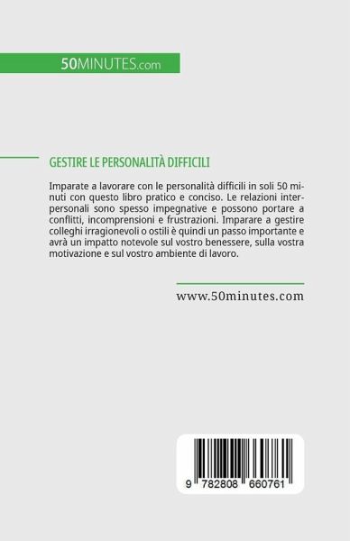 Imparate a lavorare con le personalità difficili in soli 50 minuti con questo libro pratico e conciso. Le relazioni interpersonali sono spesso impegnative e possono portare a conflitti, incomprensioni e frustrazioni. Imparare a gestire colleghi irragionevoli o ostili è quindi un passo importante e avrà un impatto notevole sul vostro benessere, sulla vostra motivazione e sul vostro ambiente di lavoro. In questo libro imparerete a gestire i colleghi difficili, comprendendo il loro comportamento e lavorando sulle vostre capacità di comunicazione. Include anche consigli utili sulla gestione di persone esigenti e consigli personalizzati per una serie di tipi di personalità difficili, fornendo gli strumenti necessari per migliorare le relazioni professionali.