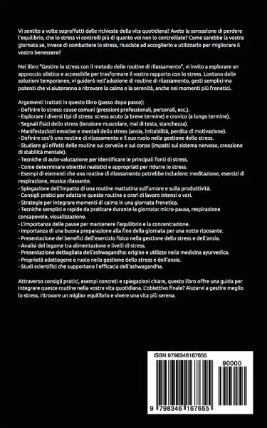 Vi sentite a volte sopraffatti dalle richieste della vita quotidiana? Avete la sensazione di perdere l'equilibrio, che lo stress vi controlli più di quanto voi non lo controlliate? Come sarebbe la vostra giornata se, invece di combattere lo stress, riusciste ad accoglierlo e utilizzarlo per migliorare il vostro benessere? Nel libro "Gestire lo stress con il metodo delle routine di rilassamento", vi invito a esplorare un approccio olistico e accessibile per trasformare il vostro rapporto con lo stress. Lontano dalle soluzioni temporanee, vi guiderò nell'adozione di routine di rilassamento, gesti semplici ma potenti che vi aiuteranno a ritrovare la calma e la serenità, anche nei momenti più frenetici. Argomenti trattati in questo libro (passo dopo passo): - Definire lo stress: cause comuni (pressioni professionali, personali, ecc.). - Esplorare i diversi tipi di stress: stress acuto (a breve termine) e cronico (a lungo termine). - Segnali fisici dello stress (tensione muscolare, mal di testa, stanchezza). - Manifestazioni emotive e mentali dello stress (ansia, irritabilità, perdita di motivazione). - Definire cos'è una routine di rilassamento e il suo ruolo nella gestione dello stress. - Studiare gli effetti delle routine sul cervello e sul corpo (impatti sul sistema nervoso, creazione di stabilità mentale). - Tecniche di auto-valutazione per identificare le principali fonti di stress. - Come determinare obiettivi realistici e appropriati per ridurre lo stress. - Esempi di elementi che una routine di rilassamento potrebbe includere: meditazione, esercizi di respirazione, musica rilassante. - Spiegazione dell'impatto di una routine mattutina sull'umore e sulla produttività. - Consigli pratici per adattare queste routine a orari di lavoro intensi o vari. - Strategie per integrare momenti di calma in una giornata frenetica. - Tecniche semplici e rapide da praticare durante la giornata: micro-pausa, respirazione consapevole, visualizzazione. - L'importanza delle pause per mantenere l'equilibrio e la concentrazione. - Importanza di una buona preparazione alla fine della giornata per una notte riposante. - Presentazione dei benefici dell'esercizio fisico nella gestione dello stress e dell'ansia. - Analisi del legame tra alimentazione e livelli di stress. - Presentazione dettagliata dell'ashwagandha: origine e utilizzo nella medicina ayurvedica. - Proprietà adattogene e ruolo nella gestione dello stress e dell'ansia. >Attraverso consigli pratici, esempi concreti e spiegazioni chiare, questo libro offre una guida per integrare queste routine nella vostra vita quotidiana. L'obiettivo finale? Aiutarvi a gestire meglio lo stress, ritrovare un miglior equilibrio e vivere una vita più serena.