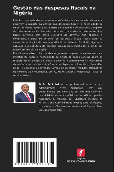 Este livro pretende desencadear uma reflexão sobre as complexidades que envolvem a questão da análise das despesas fiscais, a necessidade de dispor de dados fiáveis para a análise e a tomada de decisões, o impacto de todas as renúncias, isenções, feriados, concessões e todas as receitas fiscais perdidas pelo braço executivo do governo. Não obstante a compreensão geral do conceito de despesas fiscais, para além da crescente aceitação da sua importância no sistema fiscal da Nigéria, a natureza e a estrutura do conceito permanecem indefinidas e ainda por estabilizar no seio da Nação.Em última análise, o livro pretende galvanizar e gerar interesse em mais investigação sobre a necessidade de dispor de dados exactos sobre as receitas fiscais perdidas e ajudar o governo a compreender as implicações da renúncia de receitas sob a forma de dispensas e incentivos. Para além disso, é necessário desvendar formas de identificar medidas alternativas de incentivo ao investimento, em vez de renunciar a importantes fluxos de receitas fiscais.