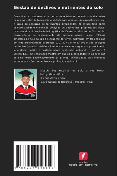 Quantificar e compreender a perda de nutrientes do solo sob diferentes bases agrícolas de topografia ondulada para uma gestão específica do local e taxas de aplicação de fertilizantes direcionadas. O estudo teve como objetivo avaliar o efeito das posições de declive nas propriedades físico-químicas do solo na bacia hidrográfica de Danka, no distrito de Dinsho. Em consequência do levantamento de reconhecimento, foram colhidas amostras de solo do tipo de utilização de terras cultivadas em três réplicas em três profundidades diferentes (0-0, 20-40 e 40-60 cm) e três posições de declive (superior, médio e inferior), analisadas segundo o procedimento laboratorial padrão e posteriormente analisadas utilizando o software R versão 4.1.1. Os resultados mostraram que as propriedades físico-químicas do solo foram significativamente (P ¿ 0,05) influenciadas pela interação entre as posições de declive e a profundidade do solo.