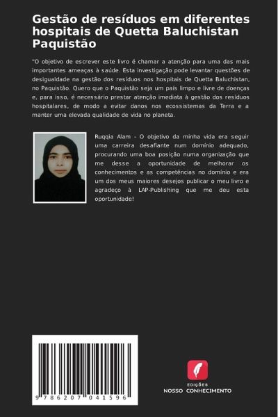 "O objetivo de escrever este livro é chamar a atenção para uma das mais importantes ameaças à saúde. Esta investigação pode levantar questões de desigualdade na gestão dos resíduos nos hospitais de Quetta Baluchistan, no Paquistão. Quero que o Paquistão seja um país limpo e livre de doenças e, para isso, é necessário prestar atenção imediata à gestão dos resíduos hospitalares, de modo a evitar danos nos ecossistemas da Terra e a manter uma elevada qualidade de vida no planeta.