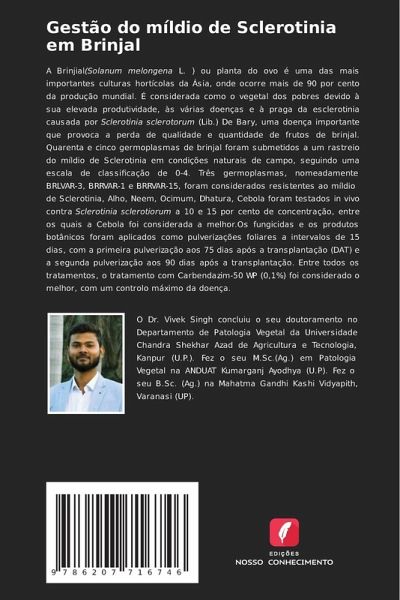 A Brinjial(Solanum melongena L. ) ou planta do ovo é uma das mais importantes culturas hortícolas da Ásia, onde ocorre mais de 90 por cento da produção mundial. É considerada como o vegetal dos pobres devido à sua elevada produtividade, às várias doenças e à praga da esclerotinia causada por Sclerotinia sclerotorum (Lib.) De Bary, uma doença importante que provoca a perda de qualidade e quantidade de frutos de brinjal. Quarenta e cinco germoplasmas de brinjal foram submetidos a um rastreio do míldio de Sclerotinia em condições naturais de campo, seguindo uma escala de classificação de 0-4. Três germoplasmas, nomeadamente BRLVAR-3, BRRVAR-1 e BRRVAR-15, foram considerados resistentes ao míldio de Sclerotinia, Alho, Neem, Ocimum, Dhatura, Cebola foram testados in vivo contra Sclerotinia sclerotiorum a 10 e 15 por cento de concentração, entre os quais a Cebola foi considerada a melhor.Os fungicidas e os produtos botânicos foram aplicados como pulverizações foliares a intervalos de 15 dias, com a primeira pulverização aos 75 dias após a transplantação (DAT) e a segunda pulverização aos 90 dias após a transplantação. Entre todos os tratamentos, o tratamento com Carbendazim-50 WP (0,1%) foi considerado o melhor, com um controlo máximo da doença.