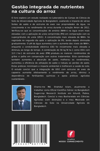 O livro explora um estudo realizado no Laboratório de Campo de Ciência do Solo da Universidade Agrícola do Bangladesh, avaliando o impacto de várias fontes de azoto e de estrume de aves nas propriedades da água, no crescimento e no rendimento do arroz durante a estação Aman de 2011. Verificou-se que as concentrações de amónio (NH4+) na água eram mais elevadas com a aplicação de ureia comprimida (PU) em comparação com os supergrânulos de ureia (USG). A concentração mais elevada de NH4+ foi registada no segundo dia após a aplicação de PU, tendo depois diminuído gradualmente. O pH da água aumentou com o aumento dos níveis de NH4+, enquanto a condutividade eléctrica (CE) foi inicialmente mais elevada e diminuiu ao longo do tempo. A combinação de 56 kg N ha-1 como USG com 3,0 t ha-1 de estrume de aves (PM) produziu os maiores rendimentos de grãos e palha em comparação com outros tratamentos. Esta combinação também aumentou a absorção de azoto, melhorou os rendimentos, aumentou a eficiência da utilização do azoto e reduziu as perdas de azoto. Estas práticas minimizam o impacto ambiental e melhoram a saúde do solo. O estudo conclui que a integração de USG com estrume de aves de capoeira aumenta efetivamente o rendimento do arroz, diminui a dependência de fertilizantes químicos e apoia práticas agrícolas sustentáveis.