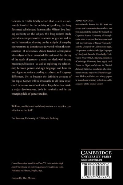 1. The domain of gesture; 2. Visible action as gesture; 3. Western interest in gesture from classical antiquity to the eighteenth century; 4. Four contributions from the nineteenth century: Andrea de Jorio, Edward Tylor, Garrick Mallery and Wilhelm Wundt; 5. Gesture studies in the twentieth century: recession and return; 6. Classifying gestures; 7. Gesture units, gesture phrases and speech; 8. Deployments of gesture in the utterance; 9. Gesture and speech in semantic interaction; 10. Gesture and referential meaning; 11. On pointing; 12. Gestures of the 'precision-grip': topic, comment and question markers; 13. Two gesture families of the open hand; 14. Gesture without speech: the emergence of kinesic codes; 15. Gesture and sign on common ground; 16. Gesture, culture and the communication economy; 17. The status of gesture; Appendix I. Transcription conventions; Appendix II. The recordings.