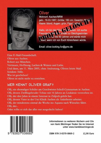 Oliver aus Aachen und Robert aus München lernen sich in einem Internet-Forum kennen. Bald entwickelt sich eine E-Mail-Freundschaft, in der die intimsten Geheimnisse preisgegeben werden. Plötzlich, von einem Tag auf den anderen, meldet sich Oliver nicht mehr. Auf der Grundlage des originalen E-Mail-Wechsels zeichnet Hank Blöchinger eine wahre Geschichte nach, deren jähes Ende bis heute nicht geklärt ist.