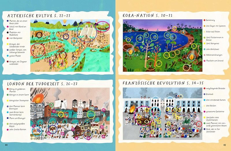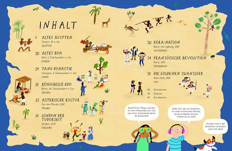 Dieses Buch lädt junge Leserinnen und Leser ein, sich auf eine Reise durch die Geschichte zu begeben: Vom alten Ägypten über das Römische Reich, von der Tang-Dynastie in China über die aztekische Kultur im Tal von Mexiko bis hin zur Französischen Revolution und den wilden 20er-Jahren in New York verbindet dieses Buch den Spaß am Suchen und Finden mit Wissenswertem aus der Geschichte.