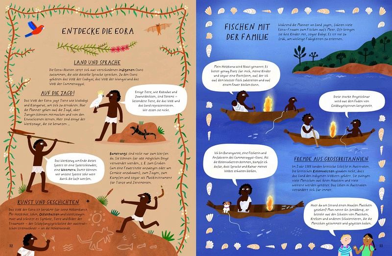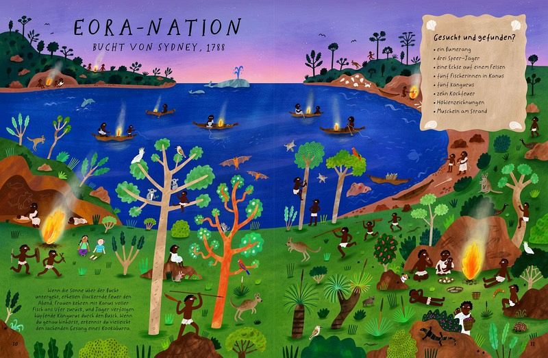 In jeder Epoche werden die Leserinnen und Leser aufgefordert, eine lebhaft illustrierte Szene zu durchsuchen, in der wichtige Personen und Gegenstände versteckt sind. Auf den Folgeseiten werden die Szenen von gut recherchierten und spielerisch erzählten Fakten begleitet, die dem jungen Publikum einen Einblick in das geben, was sie gefunden haben.