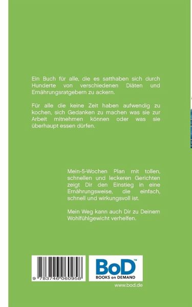Ein Buch für alle, die es satt haben, sich durch hunderte von verschiedenen Diäten und Ernährungsratgebern zu ackern.Für alle, die keine Zeit haben, aufwendig zu kochen, sich Gedanken zu machen, was sie zur Arbeit mitnehmen können oder was sie überhaupt essen dürfen.Mein 5-Wochen-Plan mit tollen, schnellen und leckeren Gerichten zeigt Dir den Einstieg in eine Ernährungsweise, die einfach, schnell und wirkungsvoll ist.Mein Weg kann auch Dir zu Deinem Wohlfühlgewicht verhelfen und Dich damit zu einem glücklicheren Menschen machen!