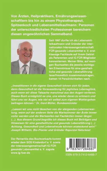 Von Ärzten, Heilpraktikern, Ernährungswissenschaftlern bis hin zu einem Physiotherapeut,Spitzenkoch und Lebensmittelkaufmann: Personen der unterschiedlichsten Professionen bereicherndiesen ungewöhnlichen Sammelband.Seit 1997 durfte ich als Lebensmittelkaufmann und Gründer der internationalenInteressengemeinschaft FÜR gesunde Lebensmittel e. V. erstklassige Fachleute auf ihrem Gebietals Referenten und IG FÜR Mitglieder kennenlernen. Meiner Bitte, auf wenigen Buchseiten die jeweils wichtigsten Erkenntnisse für eine ganzheitliche und gesunde Lebensführung leserfreundlich zusammenzutragen, kamen 14 Persönlichkeiten nach."Investitionen in die eigene Gesundheit lohnen sich für jeden, denn Gesundheit ist die Voraussetzung für jegliches Lebensglück, auch wenn wir diese Tatsache manchmal aus den Augen verlieren. Dieses Buch ermöglicht es uns, uns wieder daran zu erinnern und führt uns vor Augen, wie viel wir selbst zum eigenen Wohlergehen beitragen können." Dr. Gerd Müller, Bundesminister"Lassen wir uns nicht täuschen von der steigenden Lebenserwartung, wenn auf der anderen Seite die Wartezimmer der Ärzte immer voller werden und die Wartezeiten bei Fachärzten immer länger.(...). Aus diesem Grund begrüße ich dieses Buch mit Beiträgen und Hinweisen für eine ganzheitliche und gesunde Lebensführung (...) Achtung, Gesundheit und Lebensfreude können ansteckend sein!"Joseph Wilhelm, Bio-Pionier und Gründer Rapunzel Naturkost