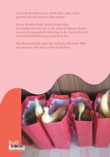 Britta Winkle-Wolf, ärztlich geprüfte Gesundheitsberaterin GGB, zeigt in diesem Buch, wie sie die gesunde Ernährung in der betrieblichen Gesundheitsförderung umgesetzt hat. Mit 100 ganz einfachen Rezepten und 100 Gesundheitsinfos wird in kleinen Häppchen das Wissen vermittelt, um allen ernährungsbedingten Krankheiten vorzubeugen. Der optimale Vitalstoffgehalt in dieser gesunden Ernährung schützt somit vor Autoimmunerkrankungen, Herz- Kreislauf- Erkrankungen, Allergien, Rheuma, Stoffwechselerkrankungen, Erkältungskrankheiten, Entzündungen und allen anderen ernährungsbedingten Zivilisationskrankheiten.