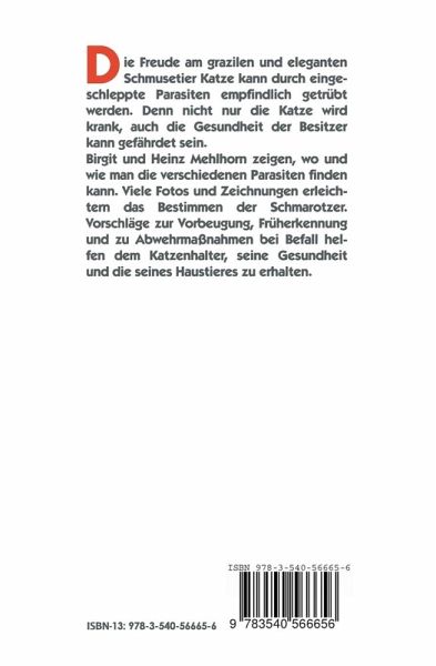 ]ber 50 Parasitenarten bedrohen die Gesundheit von Katzen. Einige dieser Erreger können auch Menschen befallen und teilweise zu gefährlichen Erkrankungen führen. Birgit und Heinz Mehlhorn erklären, wo und wie man die verschiedenen Parasiten finden und erkennen kann. Viele Photos und Zeichnungen erleichtern das Bestimmen der Schmarotzer. Vorschläge zur Vorbeugung, Früherkennung und zu Abwehrmaßnahmen bei Befall helfen dem Katzenhalter, seine Gesundheit und die seines Haustiers zu erhalten.