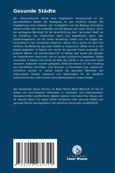 Der offensichtlichste Vorteil einer begehbaren Gemeinschaft ist der gesundheitliche Nutzen der Bewegung für den einzelnen Bürger: Die Stadtplanung kann entweder das Zufußgehen und die Nutzung alternativer Verkehrsmittel oder die Inaktivität und die Nutzung des Autos fördern. Eines der wichtigsten Merkmale für die Verwirklichung einer "gesunden Stadt" ist die Schaffung von städtischem Sport und begehbarem Raum. Das Stadtmanagement und die lokale Verwaltung sollten sich mit Fragen der Gesundheit in den Gemeinden befassen. Dieses Buch wurde mit dem Ziel verfasst, die Merkmale gesunder Städte zu analysieren. Daher ist es in vier Kapitel gegliedert. In Kapitel eins wurde die gesunde Stadt vorgestellt, mit anderen Worten: die Literaturübersicht. In Kapitel zwei wurde das Konzept der Begehbarkeit untersucht, und es wurden erfolgreiche begehbare Städte vorgestellt. In Kapitel drei wurde die Rolle des Sports in der gesunden Stadt diskutiert. Außerdem wurden geeignete städtische Räume für die Schaffung von Sportflächen wie Plätze, unter Brücken, in Strandnähe usw. untersucht. Schließlich wurden im vierten Kapitel die gesunden Merkmale des untersuchten Gebiets analysiert und Aktionspläne für die Stadtteile entsprechend den untersuchten Gesundheitsfaktoren vorgeschlagen.
