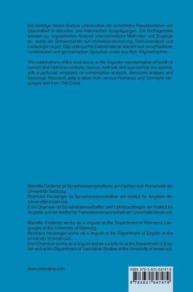 Die Beiträge dieses Buches untersuchen die sprachliche Repräsentation von Gesundheit in aktuellen und historischen Ausprägungen. Die Beitragenden wenden zur linguistischen Analyse unterschiedliche Methoden und Zugänge an, wobei die Schwerpunkte auf Interaktionsforschung, Diskursanalyse und Lexikologie liegen. Das untersuchte Datenmaterial stammt aus verschiedenen romanischen und germanischen Sprachen sowie aus dem Altgriechischen.
