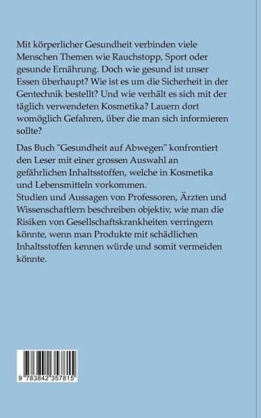 Mit körperlicher Gesundheit verbinden viele Menschen Themen wie Rauchstopp, Sport oder gesunde Ernährung. Doch wie gesund ist unser Essen überhaupt? Wie ist es um die Sicherheit in der Gentechnik bestellt? Und wie verhält es sich mit der täglich verwendeten Kosmetika? Lauern dort womöglich Gefahren, über die man sich informieren sollte?Das Buch "Gesundheit auf Abwegen" konfrontiert den Leser mit einer grossen Auswahl an gefährlichen Inhaltsstoffen, welche in Kosmetika und Lebensmitteln vorkommen.Studien und Aussagen von Professoren, Ärzten und Wissenschaftlern beschreiben objektiv, wie man die Risiken von Gesellschaftskrankheiten verringern könnte, wenn man Produkte mit schädlichen Inhaltsstoffen kennen würde und somit vermeiden könnte.