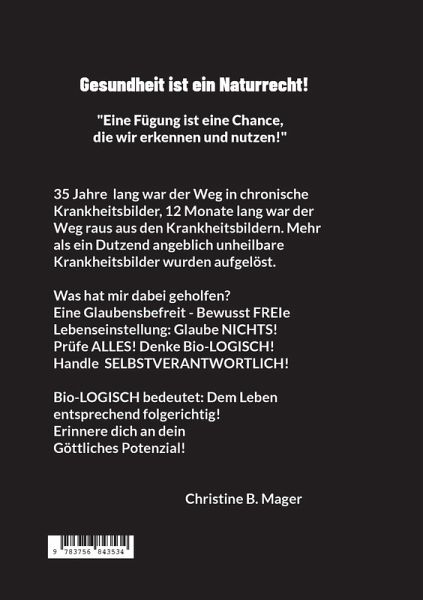 Gesundheit ist ein NaturrechtEine Fügung ist eine Chance, die wir erkennen und nutzen.Die Motivation, dieses Buch zu schreiben, kommt aus meinen Erfahrungen. Innerhalb von 12 Monaten, 04.2014 bis 04.2015, habe ich den Rückweg geschafft aus 35 Jahren in chronische Krankheitsbilder. Heute bin ich Mitte 50, und es geht mir besser als mit 19 Jahren, teils sogar besser als mit 13 Jahren. War die fühlbare Lebensqualität im April 2014 bei minus 90 Prozent, fühlte ich mich 12 Monate später bei positiven 100 Prozent.Dem Buch zugrunde liegt meine Einsicht durch meine entsprechende Lebenserfahrung: Gesundheit ist ein Naturrecht. Wenn ich dieses Buch schreibe, dann gebe ich von dem Guten, dass mir widerfahren ist, etwas zurück an die Gemeinschaft der Menschen und alle Lebensentwürfe - an die Schöpfungsfamilie - deren Teil ich bin und immer sein werde!Wenn du, liebe Leserin, lieber Leser, dieses Buch zum ersten Mal liest, dann gebe dir selbst die Chance, eine Fügung zu nutzen! Schreibe dirwährend des Lesen gleich all die Fragen auf, die sich vor die auftun! Eventuell beantworte ich sie dir später im Buch, und wenn nicht, freue ich mich über Feedback.Einfach in der Erinnerung daran, wie ich mich fühlte, als ich noch chronisch krank war und an Unheilbarkeit glaubte. Denn der Glaube an eine Unheilbarkeit war es, der mich solange chronisch krank hat bleiben lassen, und der mich ohne Unterlass viele Jahre Tag und Nacht mit einer vielfältigen Symptomatik vieler chronischer Krankheitsbilder konfrontierte. Einer der Gründe dafür, dass ich so lange nicht heilen konnte, war die Konditionierung darauf, dass ich von der Schulmedizin abhängig wäre. Aber das ist NICHT Bio-LOGISCH!Bio-LOGISCH bedeutet: dem Leben entsprechend folgerichtig! Also, wenn Schöpfungspotenzial, Göttliches Potenzial uns gesund zur Welt kommen lässt, was genau passiert dann - wann genau das - was uns chronisch krank werden lässt?Der Weg, der mich in die Vielfalt chronischer Krankheitsbilder hineingeführthat, hat mich nicht wieder herausgebracht. Das heißt, ich musste erst einmal erkennen, dass ich auf einem Gleis befand, dass nur in eine Richtung führte, immer weiter rein in chronische und immer vielfältigere Krankheitsbilder. Raus gekommen bin ich, weil ich bereit war, den Rückweg anzutreten, und dazu das Gleis wechseln musste, also erst einmal innehalten, Stop zu mir selbst sagen und Bilanz ziehen! Und den Lernprozess annehmen, der sich vor mir auftat.Christine B. Mager