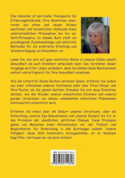 Elsa Henschel ist spirituelle Therapeutin für Erfahrungsheilkunde. Ihre Kenntnisse resultieren aus altem und neuem Wissen westlicher und fernöstlicher Heilkunde sowie unterschiedlichen Philosophien bis hin zur Seth-Philosophie. In ihrem Buch 'Gesundheit verstehen' stellt sie grundlegende Zusammenhänge und natürliche Methoden für die praktische Erhaltung und Wiedererlangung von Gesundheit vor. Lesen Sie, wie sich auf ganz natürliche Weise in unseren Zellen sowohl Gesundheit als auch Krankheit entwickeln kann. Das Verstehen dieser Vorgänge wird Ihr Leben verändern, denn Sie können diese Mechanismen einfach und erfolgreich für Ihre Gesundheit einsetzen. Wie die Untertitel dieses Buches vermuten lassen, erfahren Sie zudem aus einer vollkommen anderen Sichtweise mehr über Ihren Körper und Ihre Psyche, als Sie jemals dachten. Erlauben Sie sich neue Einsichten darüber, wie das Wunder unserer menschlichen Existenz und unseres ganzen Universums von nahezu unbekannten natürlichen Phänomenen kontinuierlich unterstützt wird. Erfahren Sie etwas über die Geburt unseres Universums, über die Entwicklung unseres Ego-Bewusstseins und unseres Körpers bis hin zu den Prinzipien der unendlichen, göttlichen Energie. Diese Prinzipien geben uns Menschen einen Aktionsradius vor, der Freiheit und Möglichkeiten für Entwicklung in alle Richtungen zulässt. Unsere Fähigkeit, diese Welt konstruktiv mitzugestalten, ist im Wachsen begriffen. Vertrauen wir uns doch einfach. Das erste Buch der Autorin Elsa Henschel mit dem Titel 'Das Geistige Prinzip' wurde 2006 bei BoD veröffentlicht. ISBN: 978-3-8334-5438-7.
